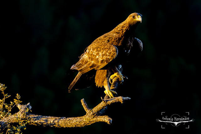 En este caso cuando los rayos del sol del amanecer inciden sobre el plumaje del águila, mientras el fondo de la montaña aún permanece en la sombra, y lo más difícil....que el águila decida entrar a su posadero durante esos pocos minutos que dura esa luz tan mágica como efímera.